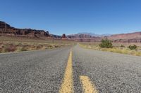 A road trip through Utah's breathtaking landscape. The straight road leads through the red rock canyons and badlands, surrounded by mountain landforms. A POV shot captures the scenic beauty of this natural environment.