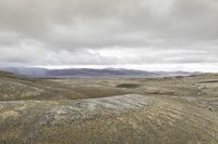 a lone person is walking through the barren hills on a cloudy day, and there are mountains in the distance