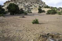 a sandy area with dirt in front of rocks and trees on the side of a mountain