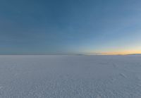 an icy field with snow and mountains in the distance at dusk with clear skies above