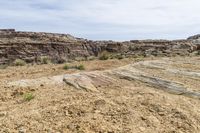 This stock photo features an area in Utah, USA with dry grass and rocks. The landscape resembles a desert with its desert-like formations on the far side. The red rock mountains and open space create a breathtaking view. The image captures the beauty of nature in its day setting, showing off the rugged terrain, bedrock outcrops, and gravel surface. The geology of the area is evident through the erosion and formation of badlands. The elevated location and grey sky add a gloomy but dramatic atmosphere to the scene. Lake Powell, a prominent feature in the region, is also visible in the distance. This photo perfectly captures the vastness and uniqueness of the Utah desert.