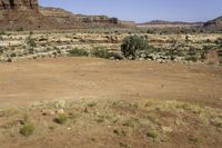 A rugged and elevated landscape in Utah, USA. Red rock formations and clear skies dominate the day. Canyons and mountain landforms create a dramatic terrain. Vegetation and grass add a touch of nature.