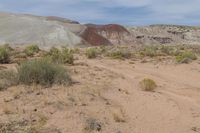 A picturesque view of the rugged landscape in Utah, USA. Red rock formations and canyons contrast with the sandy desert and grassy plains. A gravel road meanders through the stunning natural scenery.