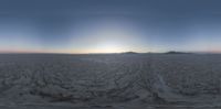 a fish eye view of an empty plain near mountains at sunset with the sun shining