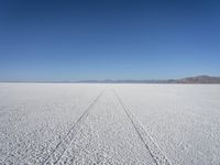 This image showcases the wide open spaces and natural beauty of the desert landscape in Utah, USA. The vast plain of sand stretches as far as the eye can see, with a calm sea in the distance. The horizon meets the clear blue sky, creating a serene and peaceful atmosphere. In the winter, the freezing temperatures create a layer of ice on the dry and salty surface of the landforms. This photo represents the unique natural environment near Salt Lake City, with its salt flats and the iconic Bonneville Speedway.