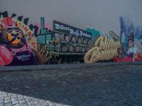 A vibrant city scene in Berlin, Germany. Cobblestone roads and graffiti-covered walls create an urban atmosphere. The sun casts hard shadows on the city's lively restaurants and bars. Experience the unique urban design and city life of Europe.