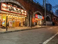 A vibrant city street in Tokyo, Japan at dawn. Street lights illuminate the road lined with storefronts and restaurants. The artificial light creates a captivating urban design. Experience the lively city life of Tokyo.