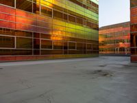 The photo captures the stunning view of a modern architecture building reflecting the vibrant glow of sunlight and color in an empty area in Holland. The city's architecture blends seamlessly with the asphalt road and open space of the residential area. The sunlight beautifully illuminates the facade and windows of the building, creating a dazzling effect. The composition of the photo highlights the symmetry and design of the office building, while the clear sky and sunshine emphasize the vibrant atmosphere of this European business district. The mix of materials, including composite, brick, and concrete, adds depth and texture to the urban design. This stock photo represents the dynamic and multicolored landscape of Holland, where art, commerce, and public space come together.