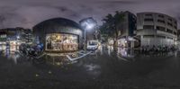 a fisheye lens photo of a street at night with a traffic light and lots of people