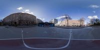 a reflection is seen in the middle of a skateboard park in europe and in the city