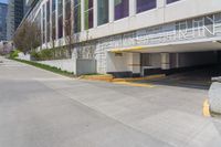 This stock photo showcases the view of a modern high rise building in the bustling city of Toronto, Ontario, Canada. The image captures a parking garage in front of the building, situated on an empty street. The building features a sleek and contemporary design, with a glass facade and composite material details. The surrounding urban landscape is highlighted by the presence of road surfaces, curbs, and driveways. Vegetation adds a touch of greenery amidst the urban setting. This image perfectly represents city life, modern architecture, and urban design in Canada's largest city - Toronto.