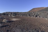 This stock photo showcases a barren terrain in California, USA, featuring a volcano surrounded by rocks and dirt. The rugged mountain landforms and rocky surface of the area contribute to its unique desert landscape. The clear sky and open space create a beautiful view, perfect for nature enthusiasts. The image captures a day in this off-road track, offering a glimpse into the wilderness of the region. The formation of the volcanic crater, along with the presence of bedrock, outcrop, rock, and rubble, highlights the geology of the area. The soil and gravel add to the texture of the landscape, making it a picturesque location for outdoor exploration.