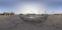 the reflection of traffic moving across a street in this circular lens image of buildings and wires