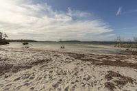 A serene coastal landscape with a sandy beach and open space. Trees line the shore, providing a natural frame to the view. The clear sky and calm surface of the ocean create a peaceful atmosphere.