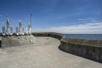 This is an image of a coastal landscape in Ontario, Canada. The photo captures the breathtaking view of the ocean horizon meeting the rocky shoreline. The concrete road and jetty provide access to the beach, creating a scenic route for tourists and vacationers. The limestone sculptures scattered along the coastline add a unique touch to the landscape. The clear sky and calm water surface reflect the tranquility of this beautiful location. The image showcases the natural beauty and architectural elements of Toronto's coastal area.