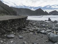 This stock photo captures the beautiful California coastline, with waves breaking near a concrete retaining wall. In the foreground, there are rocks and a sandy beach. In the distance, we can see cliffs and mountains. The image shows a typical day in this coastal landscape, with a blend of nature and man-made structures. It represents the highlands and mountain landforms of the region, as well as the wild beauty of the ocean and sea. The Big Sur area is known for its stunning cliffs and rock formations, and this photo showcases that perfectly. The Pacific Coast Highway, also known as Highway 1, runs along this coast, offering breathtaking views to travelers. The sound of the waves crashing against the rocks and the fresh ocean breeze add to the sense of wilderness and tranquility. This image is perfect for any project related to the California coast, coastal landscapes, or nature photography.