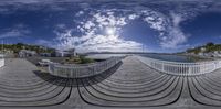 a wooden bridge going over a bay with houses and clouds in the background and a small building behind