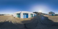 a group of small buildings in a large parking lot and sun shining down on the blue sky