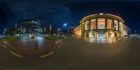 A low-profile street in Wellington, New Zealand, illuminated by artificial lights. Classic architecture and urban curves add to the charm of the night scene. A hotel and museum stand at the corner, casting a warm glow on the asphalt road.