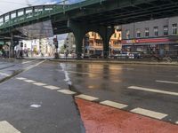A view of a wet city road in Berlin, Germany. The asphalt glistens with rainwater, reflecting the urban design and buildings. A bridge and underpass add to the mode of transport. A European urban thoroughfare.