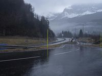 This image captures a rural road in the French Alps of Europe. The asphalt road winds through the mountain pass, surrounded by lush trees and a picturesque mountain range. The wet road surface indicates recent rainfall, adding to the rugged beauty of the highland landscape. The cloudy skies reflect the foul weather conditions often experienced in this region. This photo showcases the natural beauty and infrastructure of the French Alps in winter.