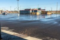 wet sidewalk next to parking lot with gas station and building in background and empty road