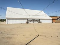 A white barn stands tall in the vast open space of rural California. Strings hang from the roof, creating a unique architectural feature. The clear sky and dirt road highlight the tranquil and rustic beauty of this landscape.