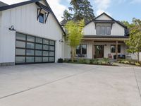 a white house with garage doors is seen from the outside out front on an open driveway