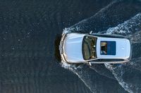 This aerial view shows a white van on a lake in Los Angeles, California, USA. The van is splashing water as it drives with its roof down. The image captures the beautiful residential area surrounding the lake, with tree-lined roads and open spaces. It is a sunny day, with high water levels in the river. The white van is a motor vehicle with a wet exterior, designed for suburban use. The elevated perspective allows for a top-down view of the van, showcasing its hood, bumper, and fluid lines of automotive design. This serene suburban scene is perfect for illustrating concepts like leisure activities, road trips, and automotive lifestyles.
