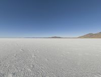 This stunning stock photo captures the beauty of a wide empty desert landscape in Utah. With no people in sight, the tranquil scene features sand stretching as far as the eye can see, contrasted by majestic mountains in the background. The clear blue sky and calm surface create a serene atmosphere, making it a perfect representation of the natural environment.