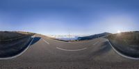 An elevated winding road in the mountains of Tenerife, Spain. The road surface is covered in ice, creating a challenging winter landscape. The low sunlight casts long shadows on the mountain range, while the clear sky and clouds provide a breathtaking backdrop.