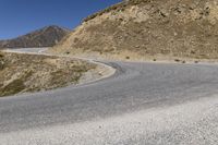 This stock photo features a stunning landscape in New Zealand, specifically on the South Island. It showcases a winding road cutting through the picturesque mountains. The road surface is smooth asphalt, perfect for a low-traffic drive. The mountains rise majestically on both sides, displaying the beauty of nature and the unique geology of the region. The clear sky above enhances the scenic view. In the middle of the road, there is a single motorcycle, adding a touch of adventure to the image. Armco barriers are visible along the road, providing safety and protection. The mountain pass creates a curve in the road, offering an exciting journey for travelers. This photo captures the serene beauty of New Zealand's mountainous landscape, making it a perfect addition to any project.