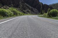 a motorcycle is riding along the winding road by some mountains in wyoming, usa, with a green patchy bushbery