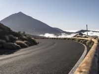 A winding road in Tenerife, Spain, leads through a breathtaking mountain landscape. The road, with its asphalt surface, curves around the volcano. Low clouds create a mystical atmosphere over the clear sky.