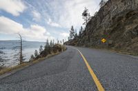 A winding road in West Kelowna, British Columbia, offers a coastal landscape view of Okanagan Lake. Mountains, rock walls, and steep slopes surround the road. Empty and free of traffic, the road is marked by a yellow warning sign.