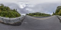 A winding road in the Canadian woods, surrounded by majestic mountains and lush forests. The panoramic images capture the beauty of the natural environment. The grey sky adds a touch of gloom to the highland landscape.