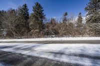 Snow-covered road in Ontario's landscape, surrounded by trees on both sides. Clear sky and clouds create a picturesque winter scene. Nature's beauty meets freezing temperatures in Toronto, Canada.
