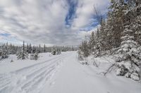 A picturesque winter landscape in British Columbia's Okanagan Valley. A snow-covered road winds through a forest of glacial slopes and towering trees. The clear blue sky and freezing temperatures create a serene and natural environment in Kelowna.
