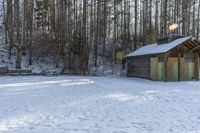 This image captures a serene landscape in a rural area of Canada. The picture showcases a snowy forest with tall trees and woody plants. The snow-covered ground and clear sky create a picturesque winter scene. In the foreground, there is an open space with a parking lot and a building. The sunlight filters through the branches, casting a beautiful glow on the snowy surface. This peaceful destination offers ample opportunity for outdoor recreation and activities. It is a perfect place to arrive and spend time surrounded by nature.