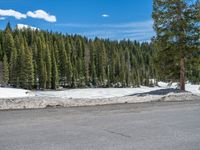 A road surrounded by snow-covered landscapes in Colorado, USA. The clear blue sky contrasts with the white snow and the serene lake. It's a beautiful winter day in nature.