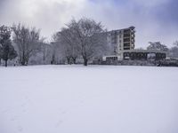 a building surrounded by trees in the snow in front of it with footprints on the snow and ground with trees