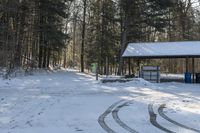 A winter landscape in Toronto, Canada. Snow-covered trees and buildings create a picturesque scene. Clear sky and street lights provide visibility on the snowy surface. A dog and its owner arrive at a rural recreational area.