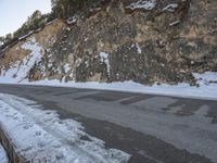 This stunning stock photo captures the break of day in Shangri-La, China. The scenery features a snow-covered mountain range in the highlands of Yunnan, with a clear sky as the backdrop. The rugged rock walls of the terrain create a dramatic and picturesque landscape. In the foreground, an asphalt road leads through the frozen landscape, reflecting the peacefulness and beauty of nature. The image showcases the natural beauty and geology of the region, making it perfect for any project related to winter, nature, or travel in Asia.