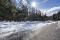 This is a picturesque winter landscape of a road in Ontario, Canada. The asphalt road winds through a forest with snow-covered trees and branches. The clear sky and shining sun cast a beautiful light on the snowy scene. The winter vegetation adds a touch of color to the otherwise monochrome landscape. This serene image showcases the beauty of nature during a sunny winter day in Ontario, with the freezing temperatures creating a peaceful and tranquil atmosphere.