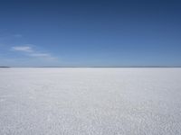This stunning stock photo captures a winter landscape in Utah's Salt Flats. The image showcases a vast snowy plain with footprints on the salt flat surface, creating a unique texture. In the background, majestic mountains rise against a clear blue sky. The calm atmosphere and azure hues make this scene truly mesmerizing. The Bonneville Speedway, located near Salt Lake City, is a popular destination for speed enthusiasts and is also visible in the distance. This image is perfect for projects related to nature, open spaces, landscapes, and the beauty of winter.