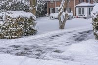 A gloomy winter morning in Toronto, Ontario, Canada. The residential area is covered in a blanket of snow. The road is lined with trees, their branches coated in snow and ice. The gray sky adds to the atmosphere of the scene. The image shows a residential building with frosty windows and a snowy asphalt road. The frozen water on the road reflects the dull light of dawn. The neighborhood appears quiet and serene under the cold weather. The image captures the beauty of the winter season in a rural area of Toronto.