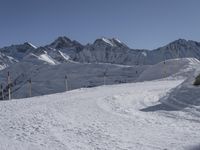 A breathtaking view of a snow-covered mountain range in the French Alps. The image captures an open space surrounded by towering mountains, with a road that curves along the cliff. This popular tourist attraction offers an amazing winter panorama, showcasing the glacial beauty of the alps. The clear sky and contrails add to the serenity of the scene. The surface is perfect for skiing, making it a great destination for winter tourism. This overview is a must-visit for nature lovers and adventure seekers in Europe.