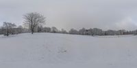 a large field covered in snow with many trees on each side of it and the sky in the background
