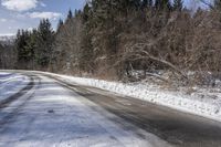 A snowy road in Ontario, Canada, surrounded by a forest of trees. The road surface is covered in snow, creating a beautiful winter landscape. The clear sky and clouds add to the serene atmosphere. There are no vehicles on the road, providing a peaceful scene. The trees and their branches are covered in snow, creating a picturesque winter wonderland. This image captures the tranquility and beauty of nature in Ontario, Canada during the winter season.