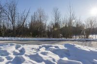 This stock photo depicts a road covered in white snow in the middle of a wooded area with tall trees. The road is made of asphalt and is located in Ontario, a province in Canada. It is a daytime shot with a scenic landscape and natural elements. The sunlight shines through the branches and creates a beautiful dawn atmosphere. The road is situated in a rural area with minimal infrastructure, surrounded by vegetation. The winter season is evident with freezing temperatures, frost, and ice covering the road. The clear sky and sunshine add a touch of warmth and brightness to the image.